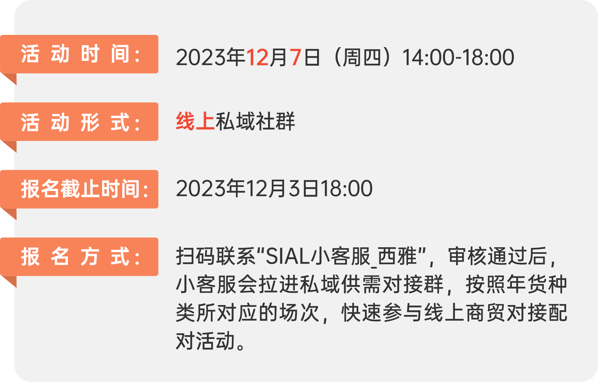 | 為了助力品牌商、經(jīng)銷商、商超等食飲全產(chǎn)業(yè)鏈打好年底最后也是最硬一場“戰(zhàn)役”,SIAL西雅國際食品展將于12月7日再次發(fā)起線上供需對接活動(dòng)“SIAL西雅展秋冬食飲采購節(jié)”,以私域流量為食飲行業(yè)供需雙方實(shí)現(xiàn)年底完美收官再添助力。 |