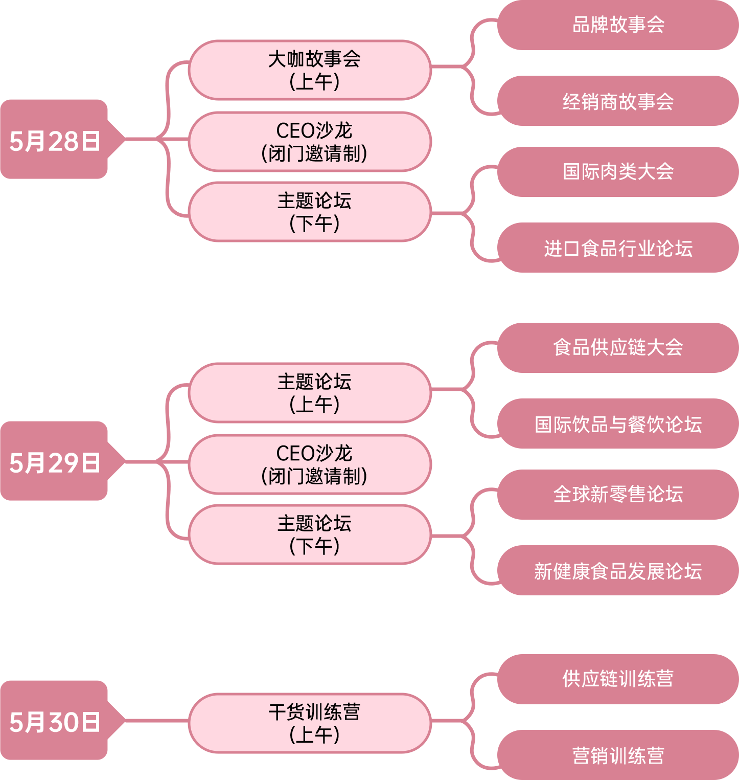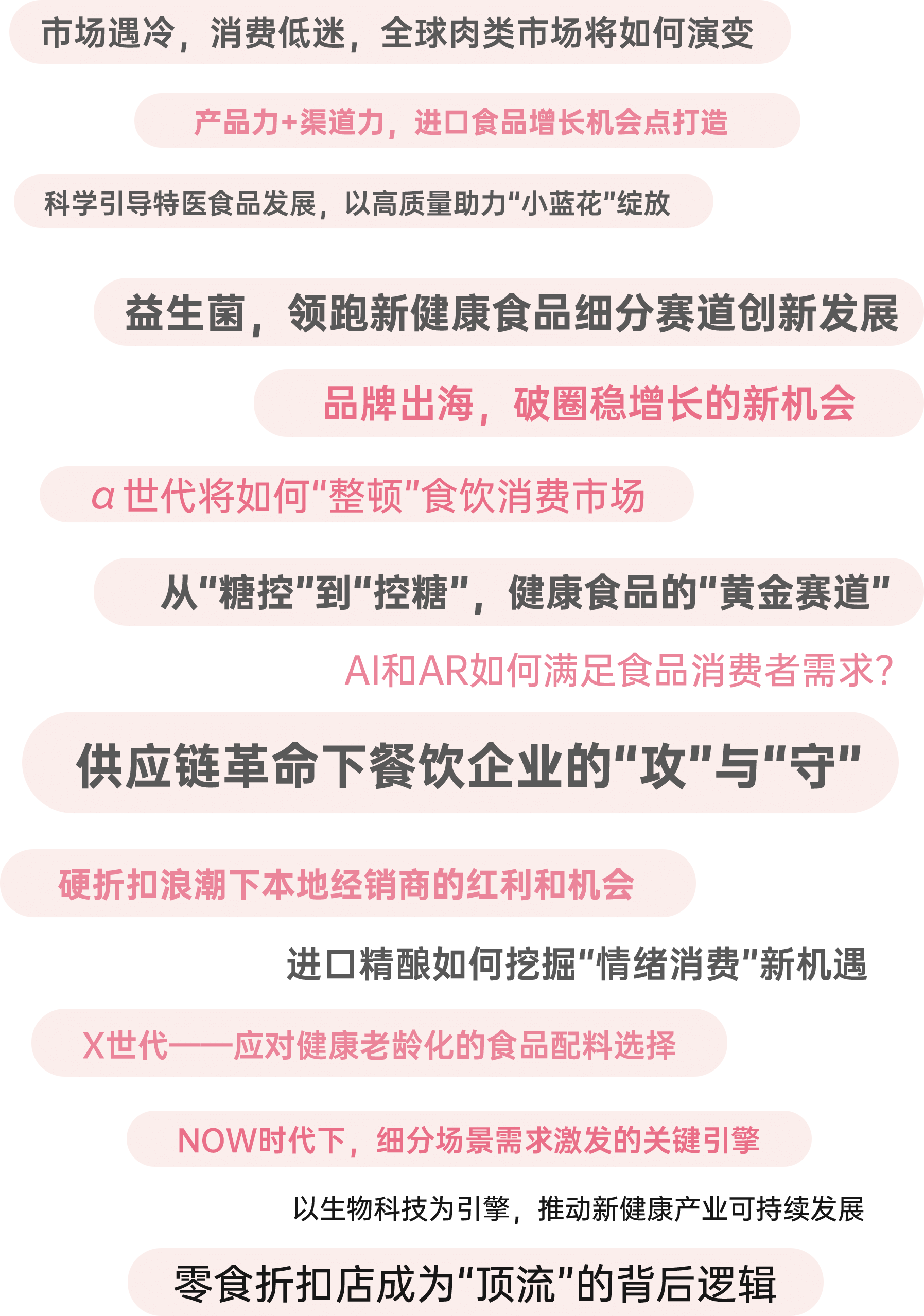 | 峰會(huì)將圍繞新零售、供應(yīng)鏈、肉類、飲品、新健康食品、食品科技、進(jìn)口食品、中餐等食飲行業(yè)熱門(mén)品類及話題舉辦10場(chǎng)主題論壇 | |||