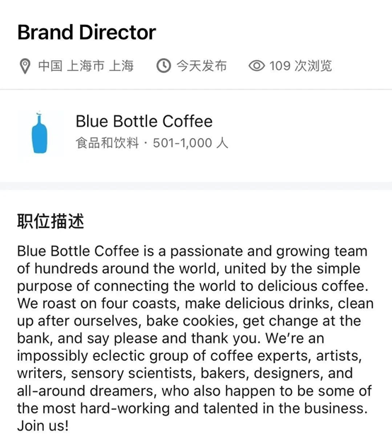 昨天,這事好像有點眉目了:起因是一張來自Linkedin領英的截圖,顯示藍瓶咖啡正在招聘“品牌總監”,工作地點在上海。