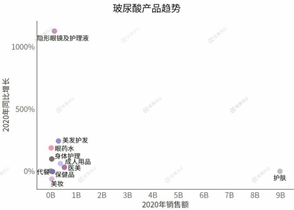 玻尿酸產(chǎn)品發(fā)展至今,主要還是集中在護膚領(lǐng)域。雖然也有口服的保健品,但銷售額僅排在第五名。排在前面的護膚和醫(yī)美,是常見的玻尿酸用途,暫且不提,但成人用品和美發(fā)護發(fā)產(chǎn)品的銷售額和同比增長比保健品還高,就讓人非常驚訝了。