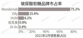 今年2月,市面上已經(jīng)出現(xiàn)了一款玻尿酸食品——代餐品牌WonderLab推出的玻尿酸軟糖。 上市一個月后,WonderLab表現(xiàn)不俗,立刻搶下了第一名,把其他品牌遠遠甩在后面。要知道2020年,HUM的市占率達到了61%,Olly的市占率達到了38%。