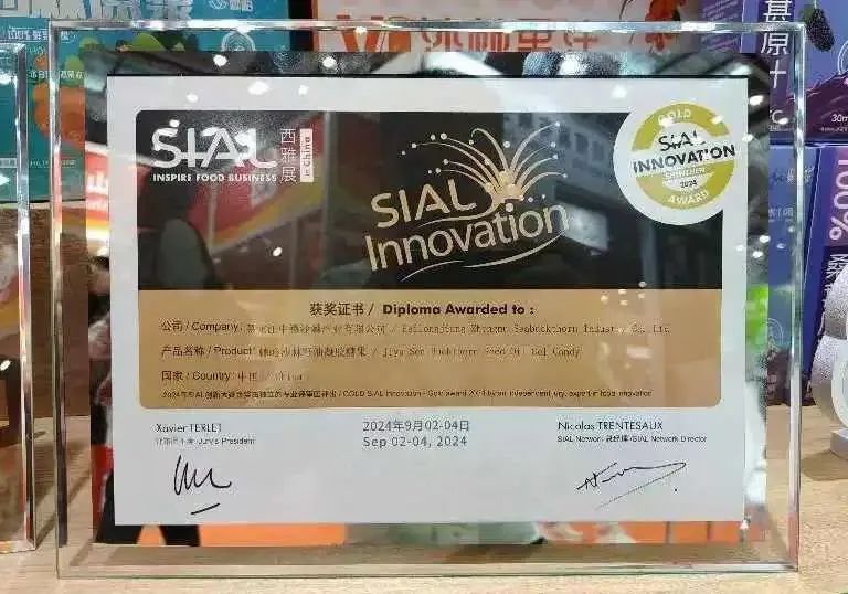 本次展會中,黑龍江省林業和草原局九珍十八品,榮獲2024年度區域公用品牌獎SIAL國際金獎,“九珍十八品”品牌入圍企業優質產品大放異彩。其中,黑龍江中穆沙棘產業有限公司沙棘籽油以優質的沙棘籽為原料制得的棕黃色到棕紅色透明的油狀液體,集沙棘有效成分一體的高度濃縮物,獲得一致好評,榮獲2024 SIAL西雅國際食品展(深圳)創新大賽唯一金獎。此外,黑龍江森林食物“九珍十八品”采山堅果禮盒、黑龍江中穆沙棘產業有限公司的沙棘原漿、黑龍江紫基食品有限公司桑葚原汁也成功入圍創新大賽;天問山生物科技股份有限公司黃精果榮膺2024 SIAL西雅國際食品展(深圳)零食節 TOP榜單。
