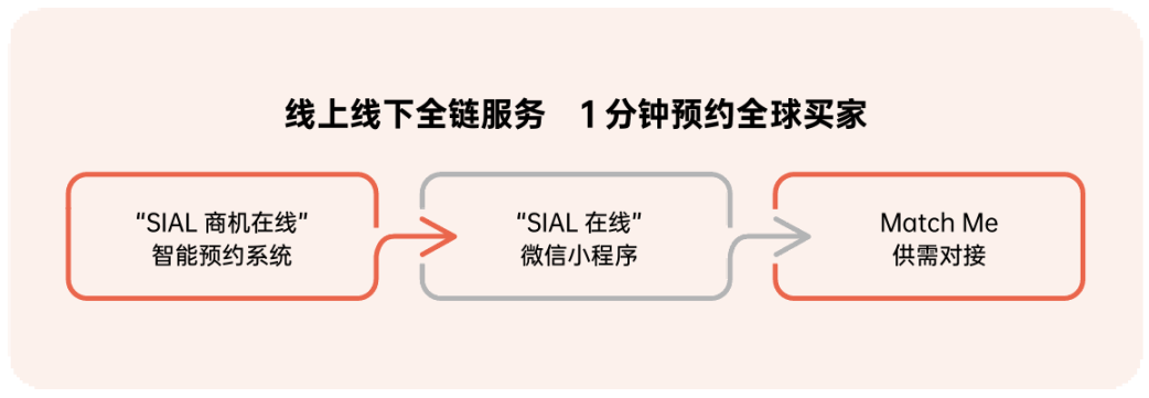SIAL 西雅展通過一系列精準高效的商貿服務,幫助展商快速找到目標買家,推動業務快速發展,如通過SIAL在線小程序全鏈服務,展商只需1分鐘即可預約全球買家,快速建立商貿聯系。